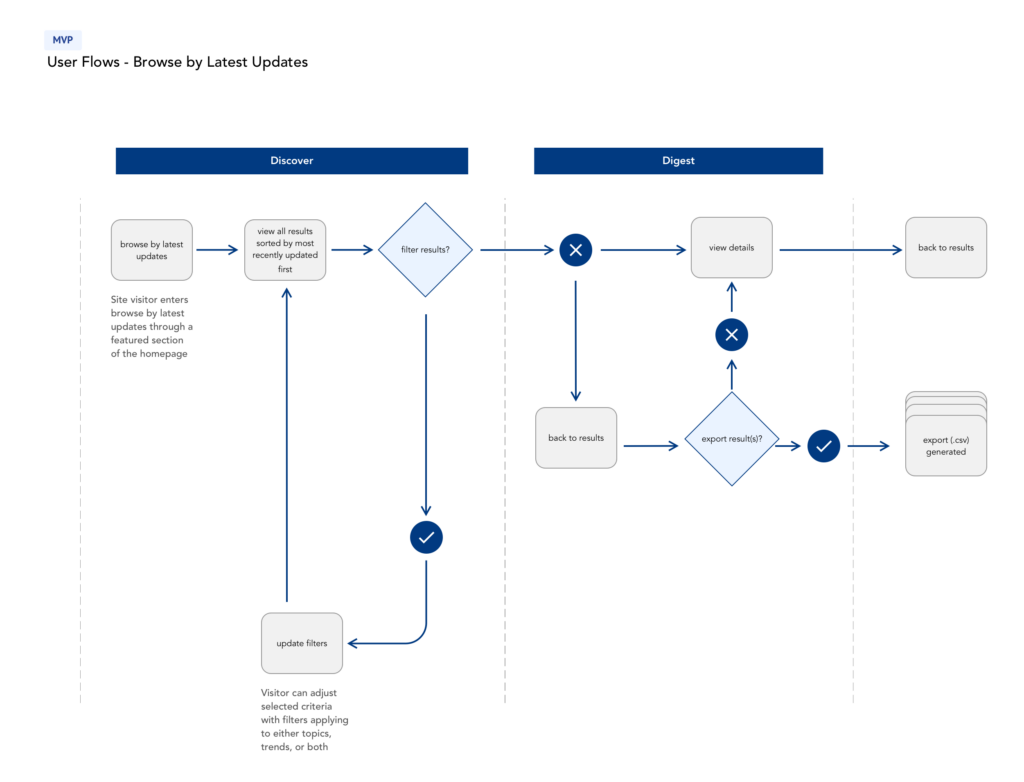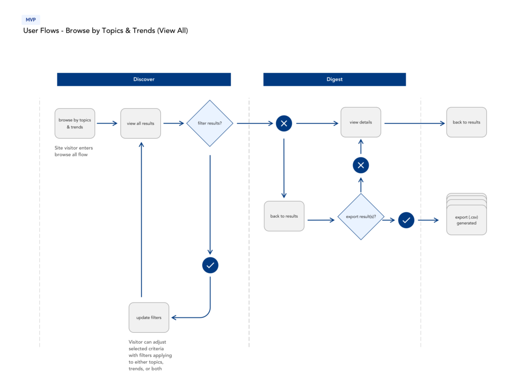 Working cross-functionally across companies and teams, I collected requirements and created user flows for various methods of search retrieval and browsing.